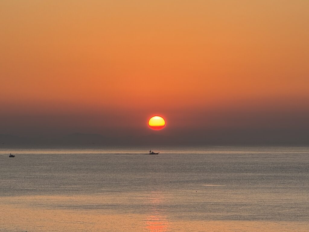 ゆっくり景色を眺めていると、朝日が海と漁船をやさしく照らしていました。